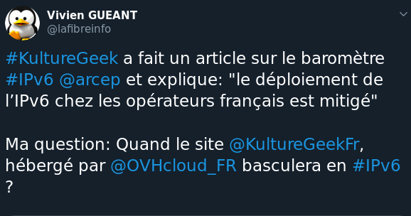 Et pourtant, bien que IPv6 peine à se normaliser, plusieurs personnes et entreprises font tout pour promouvoir IPv6. Par exemple, @lafibreinfo fait régulièrement des campagnes sur Twitter pour signaler les entreprises, opérateurs et hébergeurs qui ne sont pas encore passé en IPv6 :