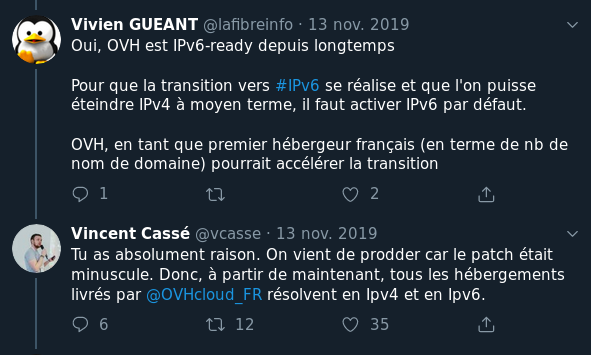 Et parfois, un simple tweet peut faire bouger les choses. En effet, @lafibreinfo a demande à OVH quand l’IPv6 serait mise par défaut sur les hébergements web. Comme vous pouvez le voir, le patch a été fait le jour même, et désormais tous les hébergements web chez OVH ont de l’IPv6 !