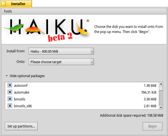L’installateur de Haiku permet d’activer ou de désactiver un certain nombre de paquets optionnels. Ces paquets (principalement des outils et bibliothèques de développement) sont maintenant désactivés par défaut en mode autonome (live CD), ce qui permet d’utiliser et d’installer le système sans problème sur les ordinateurs avec peu de mémoire (environ 300 Mo sont nécessaires).