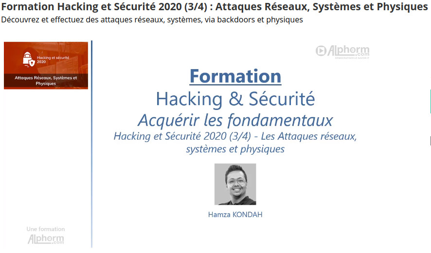 https://www.alphorm.com/tutoriel/formation-en-ligne-hacking-et-securite-2020-3of4-attaques-reseaux-systemes-et-physiques"Savoir attaquer pour mieux se défendre", telle est la maxime de cette formation Hacking et Sécurité 2020. Partir d’une approche offensive des pratiques et des méthodologies utilisées par les hackers dans le cadre d’intrusions sur les réseaux et les applications. La présente formation hacking et sécurité se compose de 4 parties :