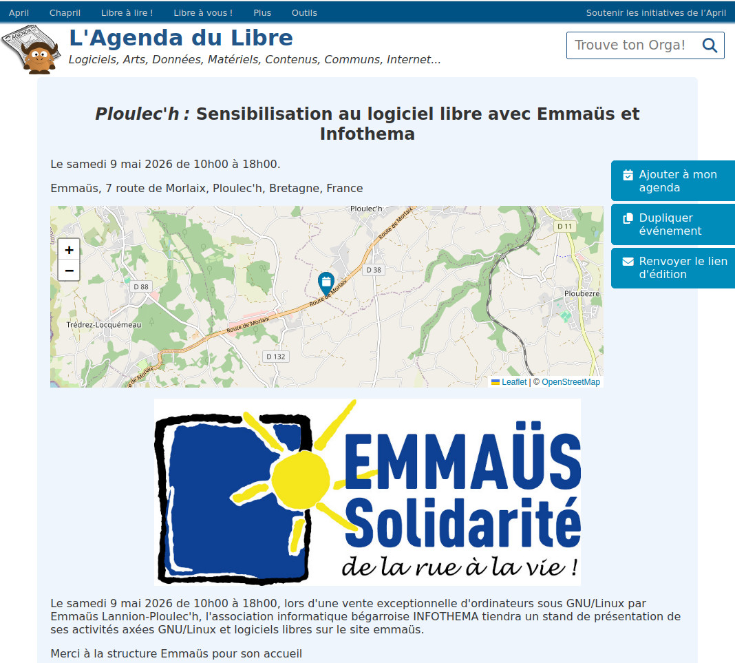 Le samedi 9 mai 2026 de 10h00 à 18h00, lors d'une vente exceptionnelle d'ordinateurs sous GNU/Linux par Emmaüs Lannion-Ploulec'h, l'association informatique bégarroise INFOTHEMA tiendra un stand de présentation de ses activités axées GNU/Linux et logiciels libres.
